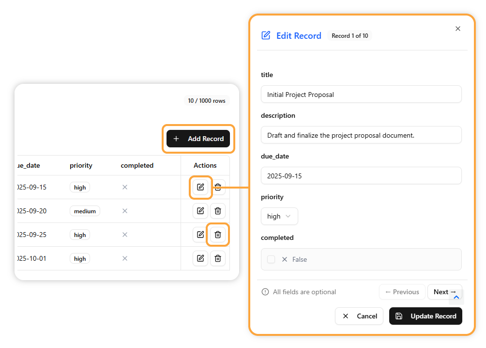 You can now make changes directly within the table cells, just like in a spreadsheet. This includes updating text fields like the task title, selecting new values from dropdowns for fields like priority, and modifying dates using a date picker for the due_date. This direct, interactive approach saves you from the tedious and error-prone process of manually editing JSON text.