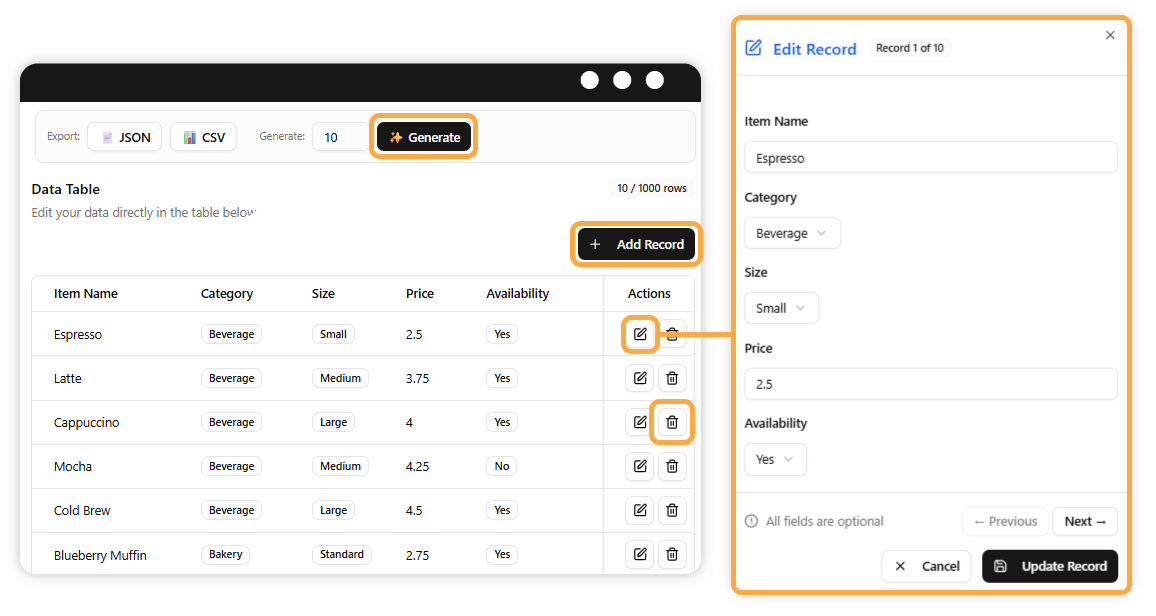 Once the data is in the table, you have full control. You can add, edit, or delete records. The editing pane is tailored to each field to ensure data integrity. The AI can also generate new data for you if needed.