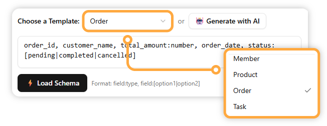 Choose from a list of pre-built templates for common data structures like Member, Product, or Event.