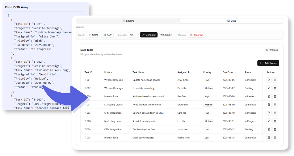 This example is just one of many ways structured data can become more usable with the right tool. Try the AI JSON CRUD Table Maker now with the sample data below, or turn your own JSON task logs into interactive tables you can actually work with — readable, editable, and ready for real collaboration.