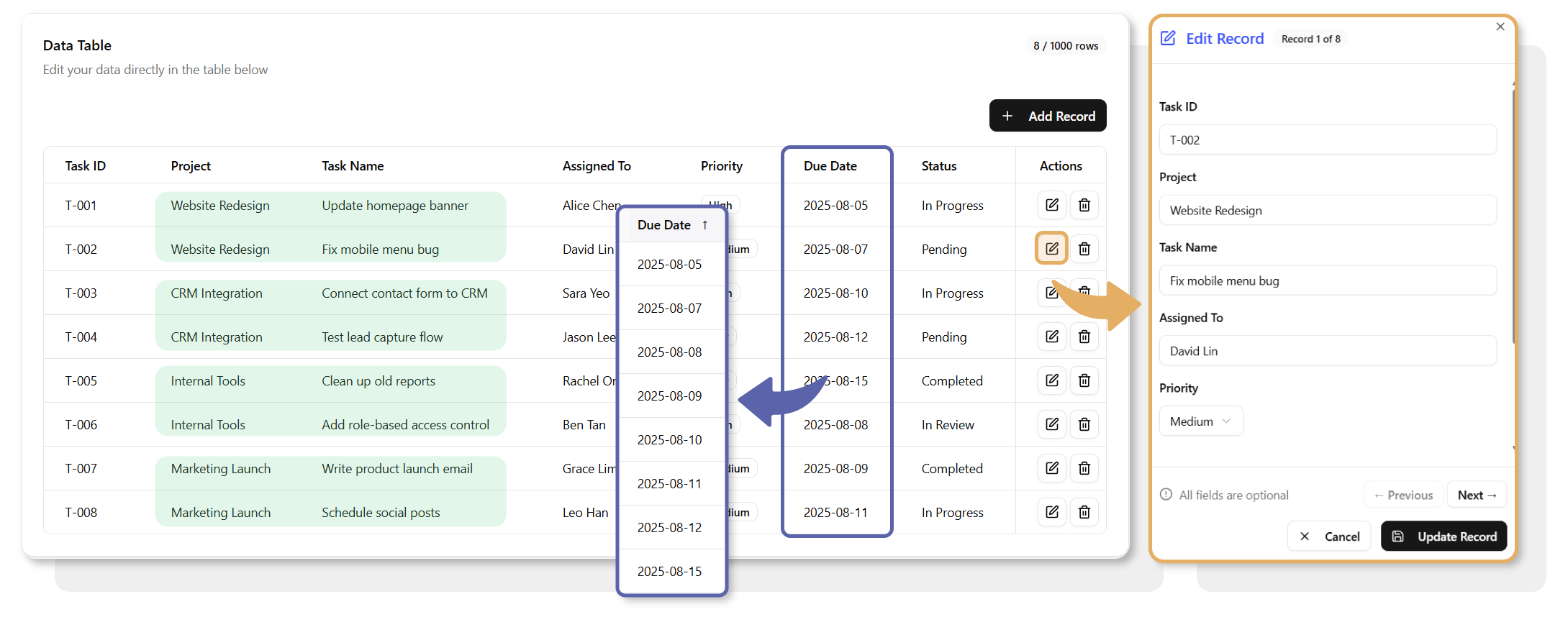 When displayed as a table, the same structured data becomes a practical interface for managing daily workflows. Tables allow teams to quickly identify what is in progress, what is overdue, and what is most urgent. Sorting by priority or filtering by project helps highlight what needs attention first.