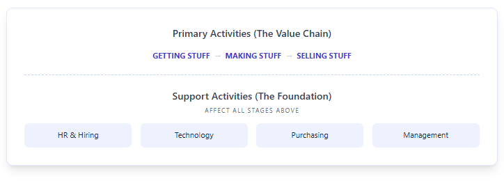 Imagine a business is like a well-oiled machine. It has parts that are directly building the final product, and other parts that keep the machine running, clean, and powered up. In the business world, we call these Primary Activities (the building parts) and Support Activities (the maintenance parts). To truly understand how a business creates value, you need to see how both work together.