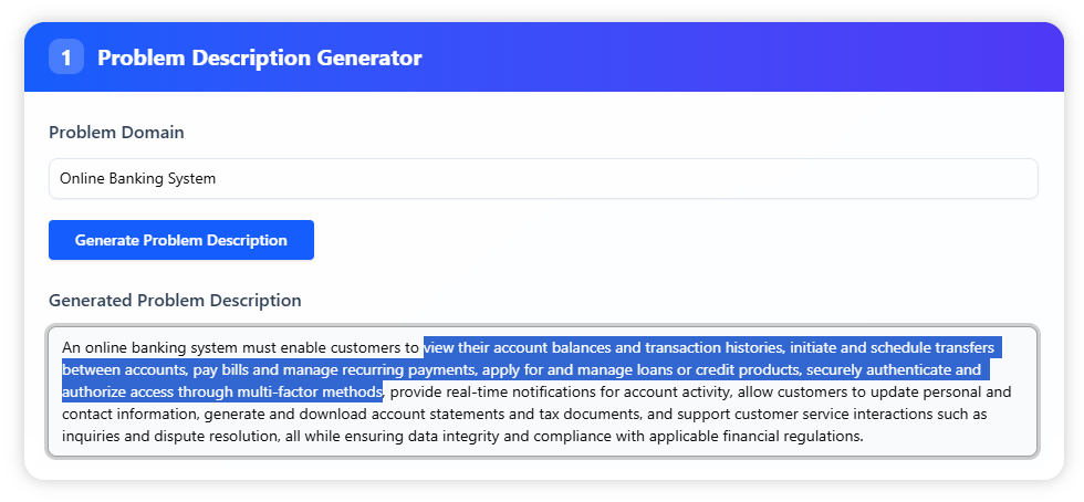 Enter Online Banking System as the problem domain. The tool creates a comprehensive and editable problem description, covering account management, fund transfers, bill payments, loan applications, authentication, notifications, and dispute resolution. You can refine the description to reflect your bank’s policies and services.