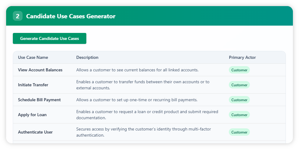 Click the “Generate Candidate Use Case” button to produce a set of candidate use cases with their name, description, and primary actor. For this case, the use cases include viewing account balances, initiating transfers, scheduling bill payments, applying for loans, authenticating users, generating statements, updating personal information, and resolving disputes.