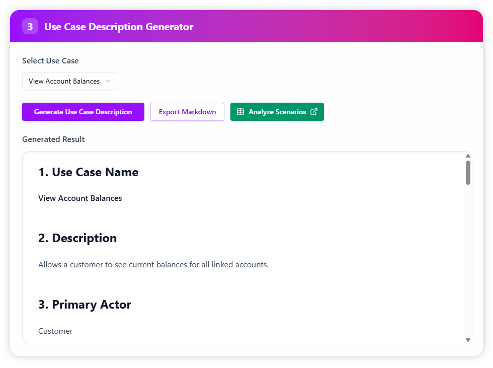Select one use case for detailed expansion. In this example, the chosen case is View Account Balances. The tool generates a structured description with preconditions, main flow, alternative flows, and exceptions, giving a complete picture of how customers access balance details. The description can also be exported in Markdown format for documentation and compliance report.