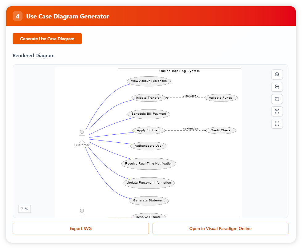 Finally, generate a use case diagram that shows customers, authentication mechanisms, and support staff interacting with banking functions. The diagram can be exported as an SVG file or opened directly in Visual Paradigm Online for editing and collaboration.