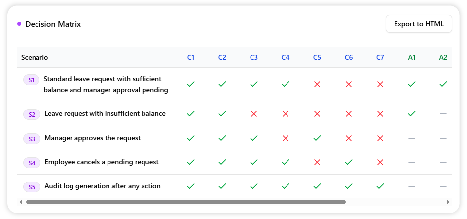 Finally, click Export to HTML to save a standalone copy of the analysis. This makes it easy to share with your team, attach to project documentation, or use as a basis for writing formal test cases.