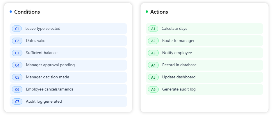 Translate these scenarios into business rules to automate your leave approval workflows, reducing manual effort.