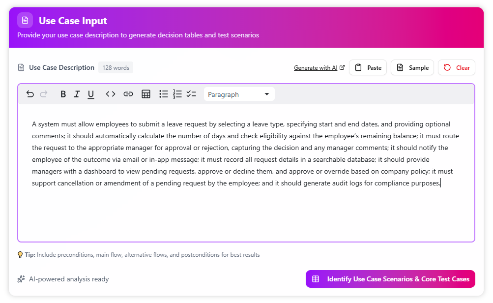 With the description in place, simply click the “Identify Use Case Scenarios & Core Test Cases” button. Our AI engine will then parse the text to understand its logical structure.