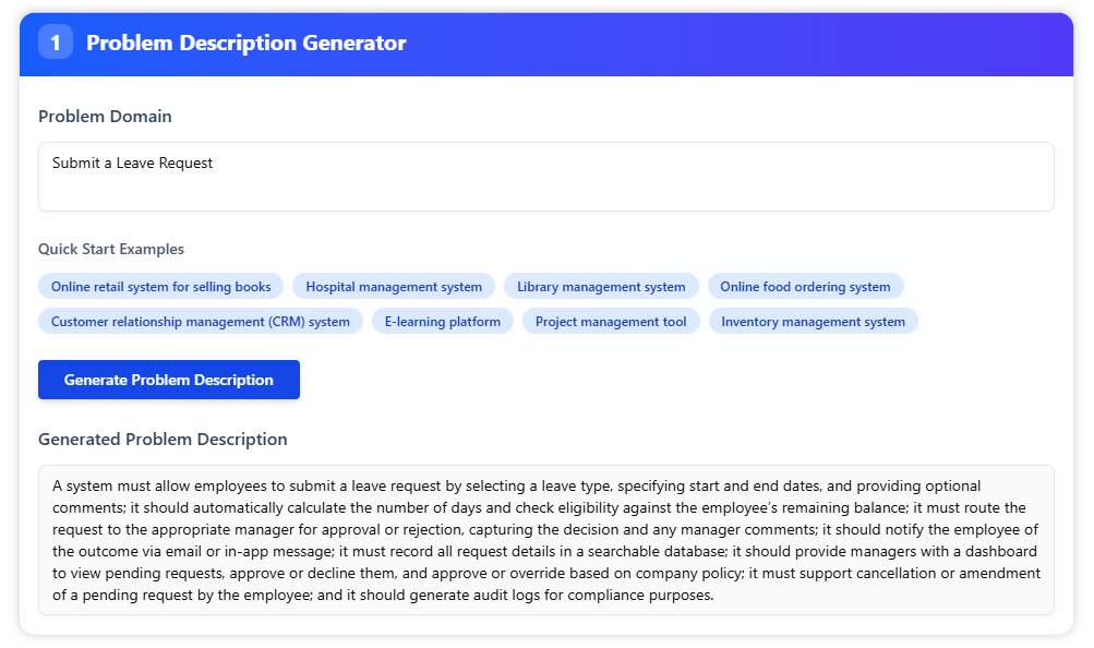 First, we feed the AI a detailed use case description. For the best results, include preconditions, main flows, and alternative flows. This rich context helps the AI deliver a more accurate and comprehensive analysis. You can also generate a high-quality description using our AI Use Case Description Generator.