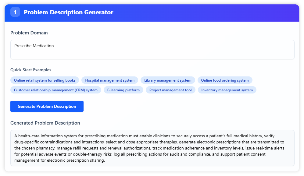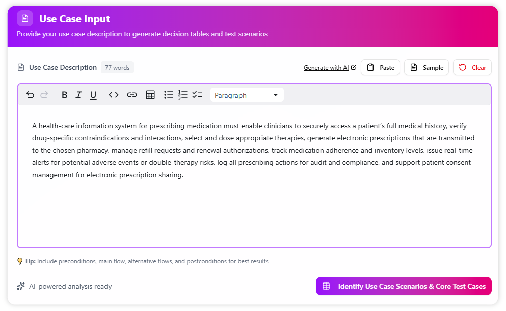 First, we feed the AI a detailed use case description. For the best results, include preconditions, main flows, and alternative flows. This rich context helps the AI deliver a more accurate and comprehensive analysis. You can also generate a high-quality description using our AI Use Case Description Generator.