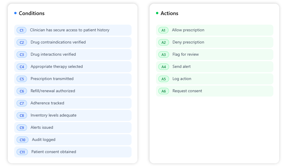 In moments, the AI produces a complete analysis. It automatically extracts all relevant Conditions and Actions, presenting them as clear, easy-to-read lists. The most powerful output is the Decision Matrix, which maps every scenario to its specific conditions and outcomes.