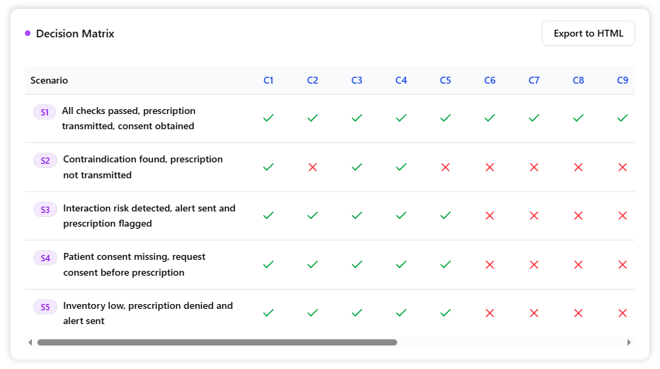 Finally, click Export to HTML to save a standalone copy of the analysis. This makes it easy to share with your team, attach to project documentation, or use as a basis for writing formal test cases.