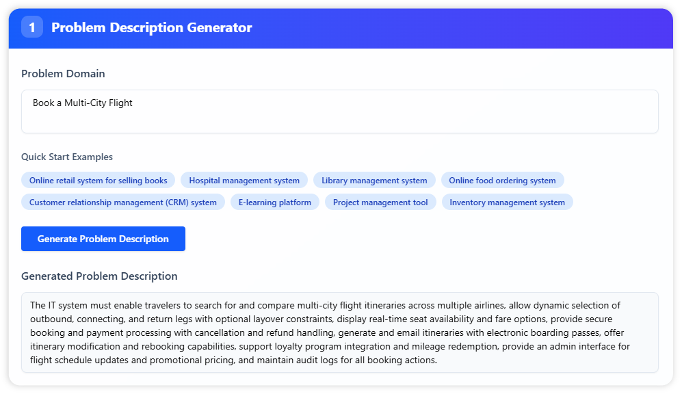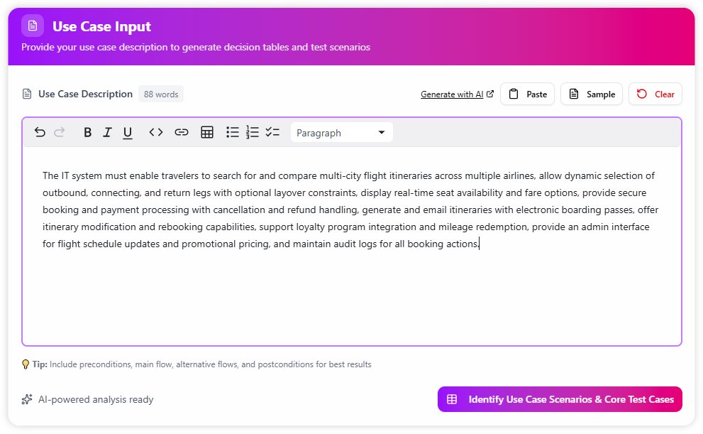 First, we feed the AI a detailed use case description. For the best results, include preconditions, main flows, and alternative flows. This rich context helps the AI deliver a more accurate and comprehensive analysis. You can also generate a high-quality description using our AI Use Case Description Generator.
