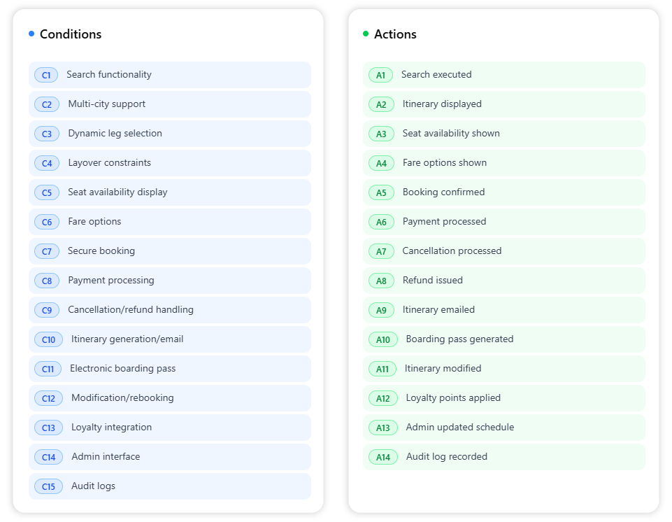 In moments, the AI produces a complete analysis. It automatically extracts all relevant Conditions and Actions, presenting them as clear, easy-to-read lists. The most powerful output is the Decision Matrix, which maps every scenario to its specific conditions and outcomes.