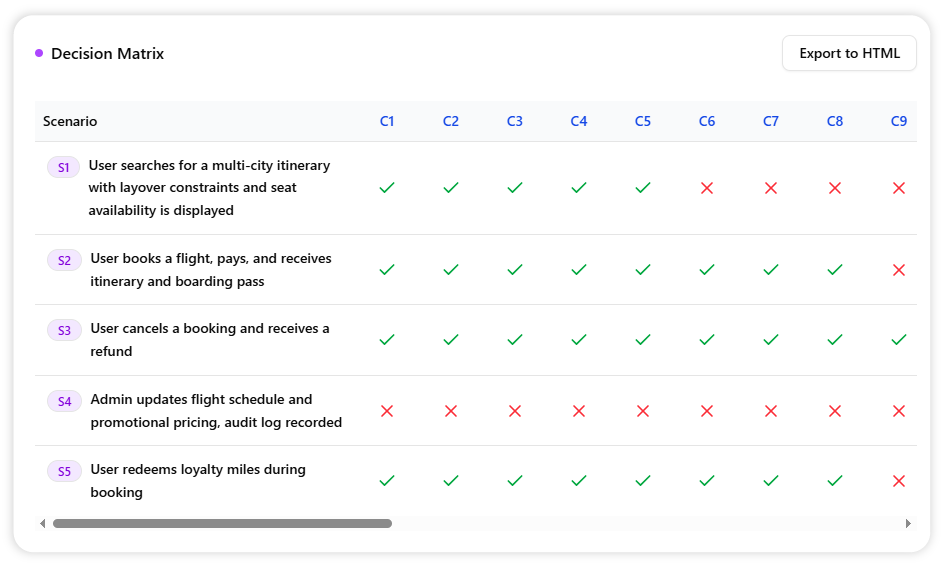 Finally, click Export to HTML to save a standalone copy of the analysis. This makes it easy to share with your team, attach to project documentation, or use as a basis for writing formal test cases.