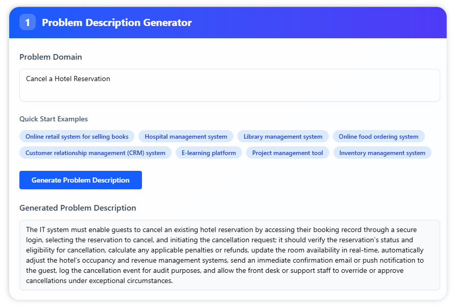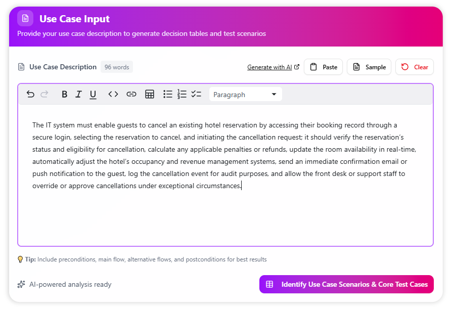 First, we feed the AI a detailed use case description. For the best results, include preconditions, main flows, and alternative flows. This rich context helps the AI deliver a more accurate and comprehensive analysis. You can also generate a high-quality description using our AI Use Case Description Generator.