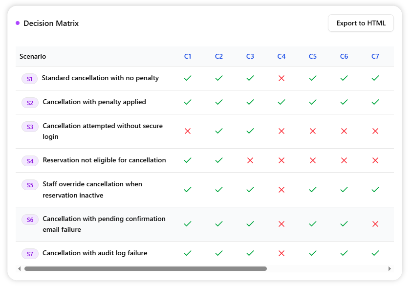 Finally, click Export to HTML to save a standalone copy of the analysis. This makes it easy to share with your team, attach to project documentation, or use as a basis for writing formal test cases.