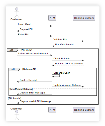 This scenario can be quickly captured in a sequence diagram, showing the customer, ATM interface, and banking system as interacting components.
