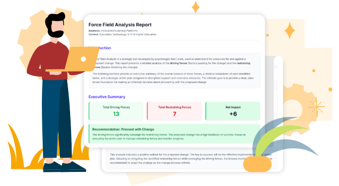 Kurt Lewin’s Force Field Analysis Framework provides a structured way to analyze these competing influences. It helps leaders and teams move beyond simple pros-and-cons lists by quantifying the forces and turning insights into an actionable plan.