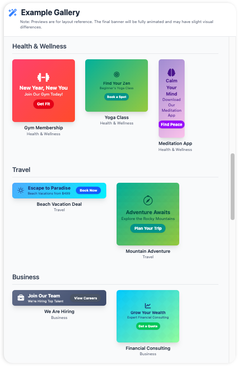Gemini AI instantly crafts a compelling title, subtitle, CTA, and suggests a relevant icon for your banner.
