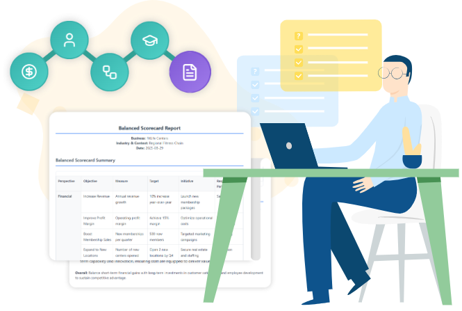 Use our app to document your findings. Define strategic objectives, list Key Performance Indicators (KPIs), and outline initiatives in the app’s structured tables.