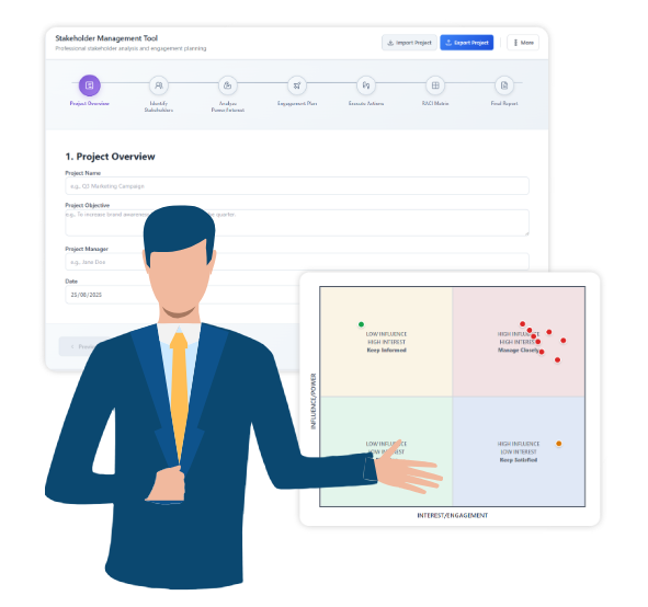 Everything you need to build a professional stakeholder management plan with a guided workflow.