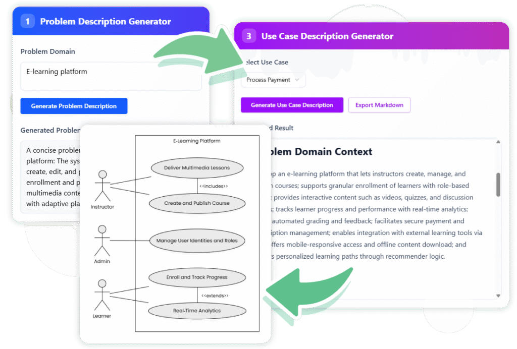 Streamline your workflow with AI that helps you generate clear project descriptions, identify critical use cases, and produce professional documentation. Our tool ensures your project starts with a solid foundation, reducing rework and accelerating your time to market.