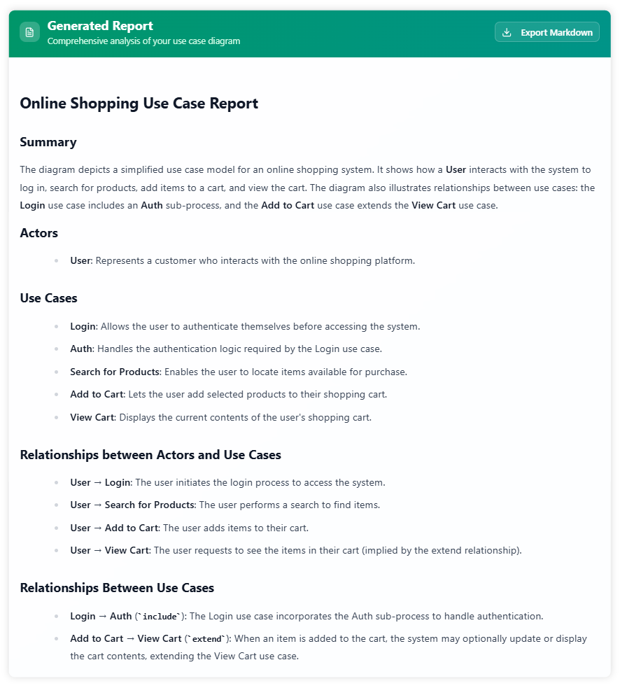 Get a comprehensive, ready-to-use report detailing every aspect of your use case diagram in clear, structured text.